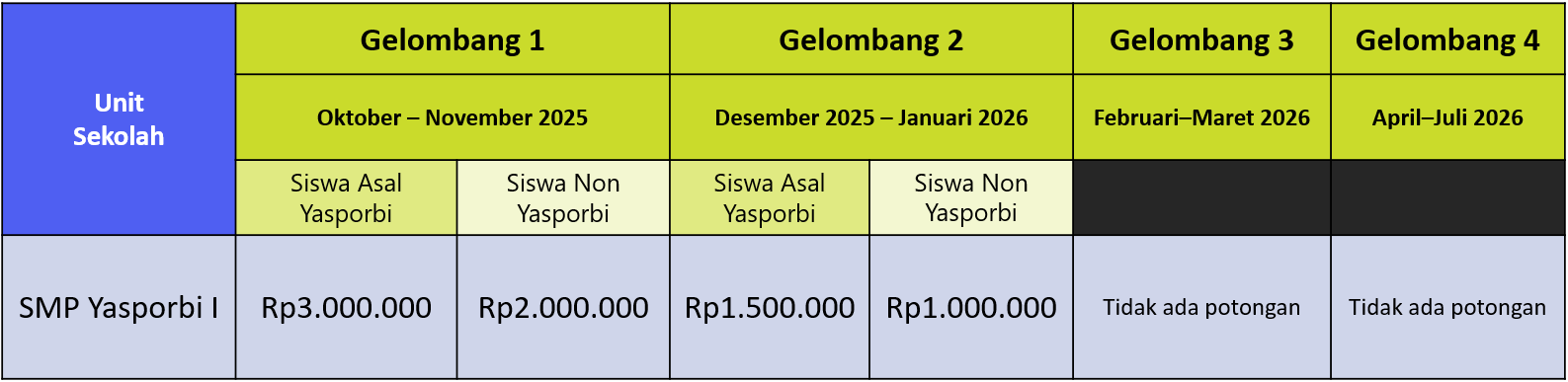 Biaya Registrasi Pendaftaran Online SMP Yasporbi I yaitu sebesar Rp 750.000 (tujuh ratus lima puluh ribu rupiah) . Pedoman pembayaran dapat dilihat disini. *non-refundable