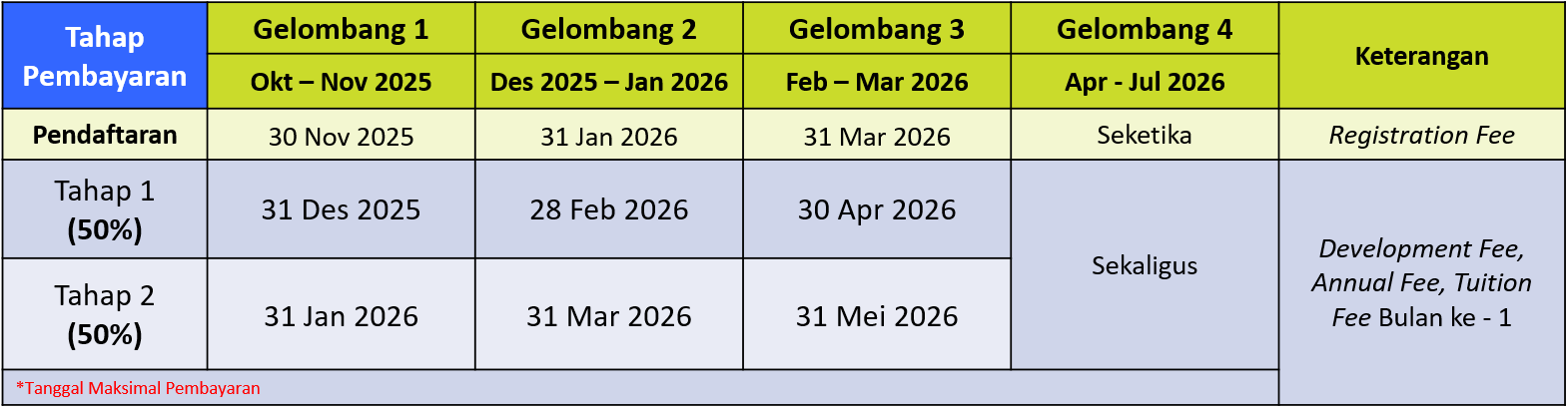 Calon siswa berasal dari gelombang tertentu, telah melakukan tahapan pembayaran tetapi tidak dapat melunasi sesuai dengan batas waktu, maka dapat diberikan kesempatan pindah gelombang berikutnya dengan batas akhir pembayaran Tahap I dan potongan uang sekolah disesuaikan gelombang pada saat waktu pelunasan. Apabila tidak melakukan pelunasan dianggap mengundurkan diri dan tidak berhak atas gelombang berikutnya.