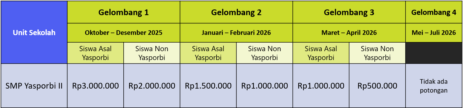 dapat diberikan kesempatan pindah gelombang berikutnya dengan batas akhir pembayaran Tahap I dan potongan uang sekolah disesuaikan gelombang pada saat waktu pelunasan. Apabila tidak melakukan pelunasan dianggap mengundurkan diri dan tidak berhak atas gelombang berikutnya.
