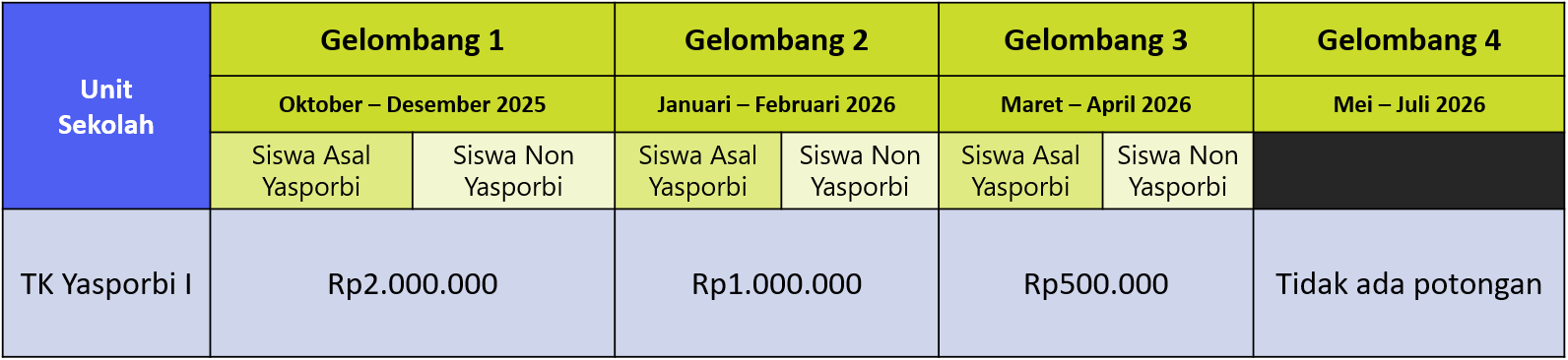 Biaya Registrasi Pendaftaran Online TK Yasporbi I yaitu sebesar Rp 500.000 (lima ratus ribu rupiah) Pedoman pembayaran dapat dilihat disini. *non-refundable