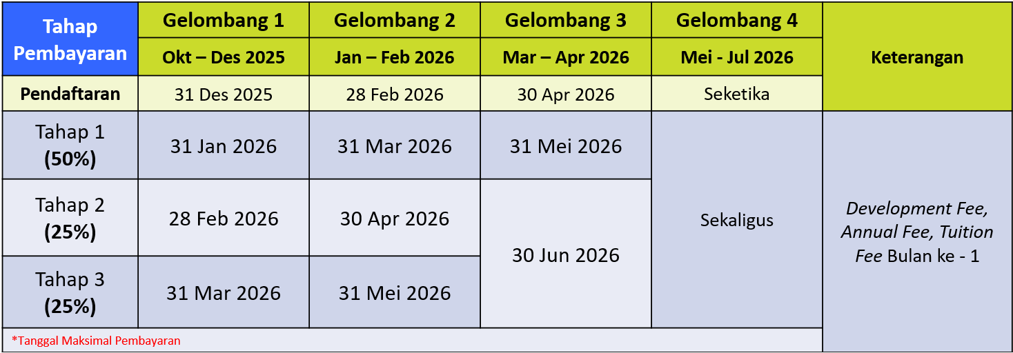 Calon siswa berasal dari gelombang tertentu, telah melakukan tahapan pembayaran tetapi tidak dapat melunasi sesuai dengan batas waktu, maka dapat diberikan kesempatan pindah gelombang berikutnya dengan batas akhir pembayaran Tahap I dan potongan uang sekolah disesuaikan gelombang pada saat waktu pelunasan. Apabila tidak melakukan pelunasan dianggap mengundurkan diri dan tidak berhak atas gelombang berikutnya.