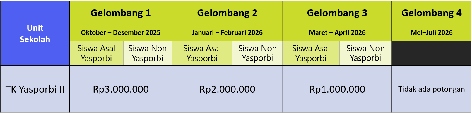 Biaya Registrasi Pendaftaran Online TK Yasporbi II yaitu sebesar Rp 500.000 (lima ratus ribu rupiah) Pedoman pembayaran dapat dilihat disini. *non-refundable